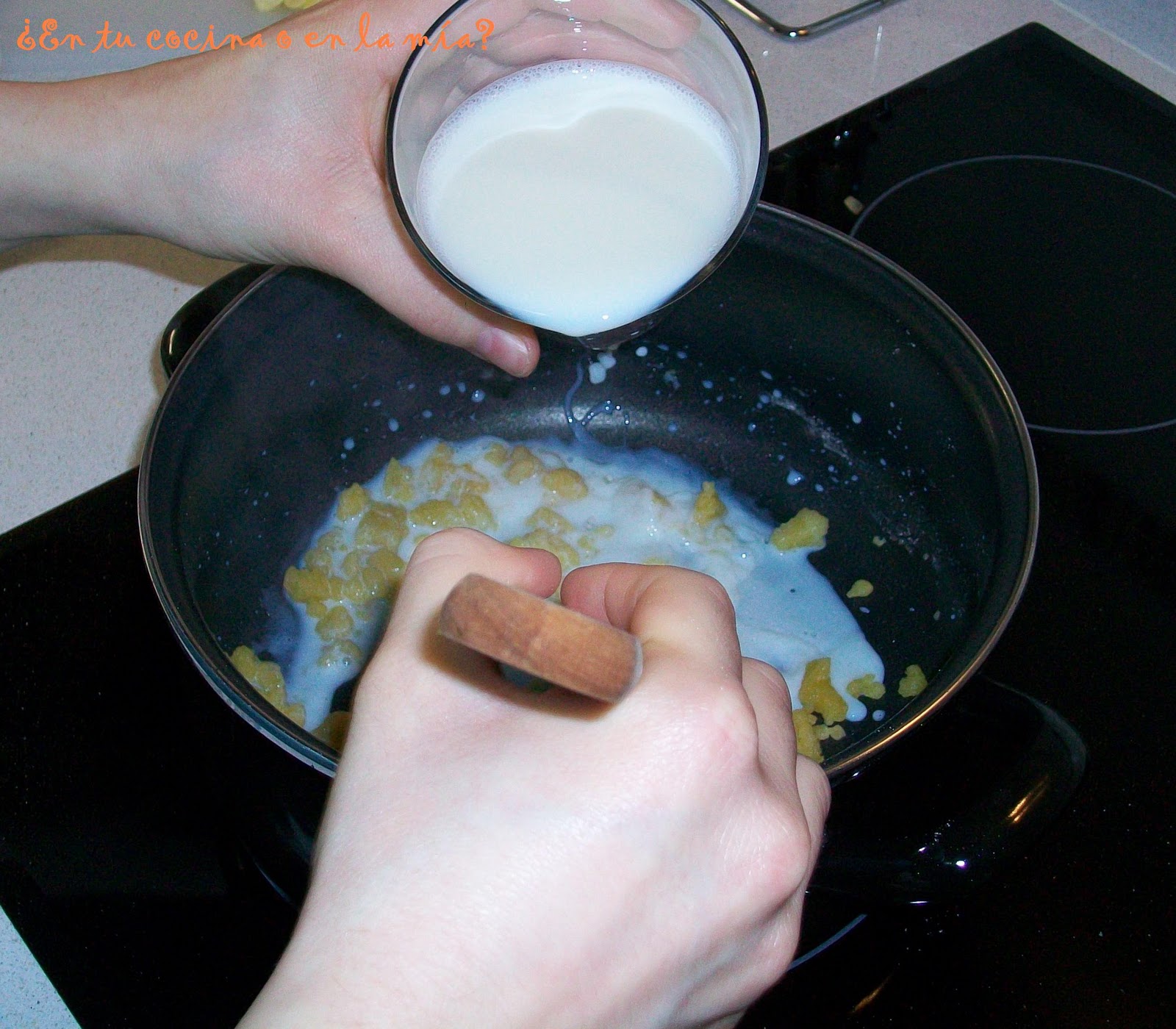 En una olla derrite la mantequilla, echa dos cucharadas de harina y mézclala, tostándola un poco a fuego medio-bajo.